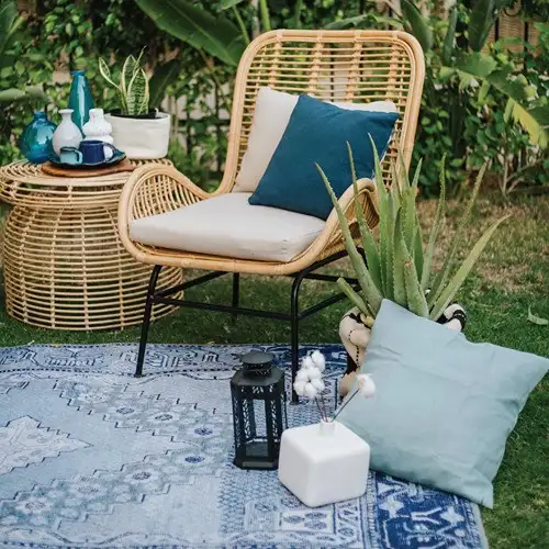 Description : A stylish waiting chair handcrafted from natural bamboo and treated  simple and functional design that cozy corners. Materials : High-quality natural bamboo Treated, weather-resistant rattan Weather-resistant fabric High-quality soft foam...