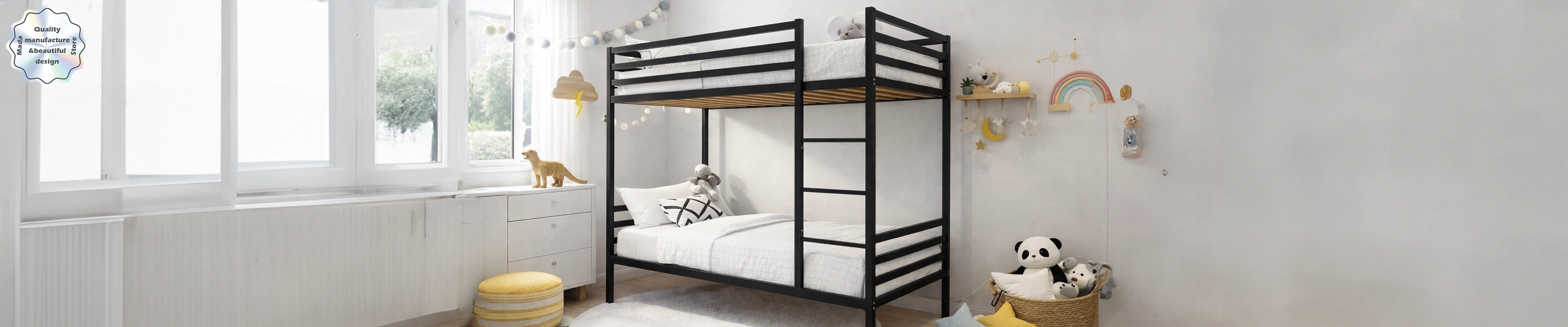 Description : A classic metal bunk bed providing children with a comfortable sleeping experience from Mada Store. Materials : Electrostatic painted iron Musky wood mattress Dimensions : Height : 180 cm Width : 110 cm Length : 200 cm Addit...