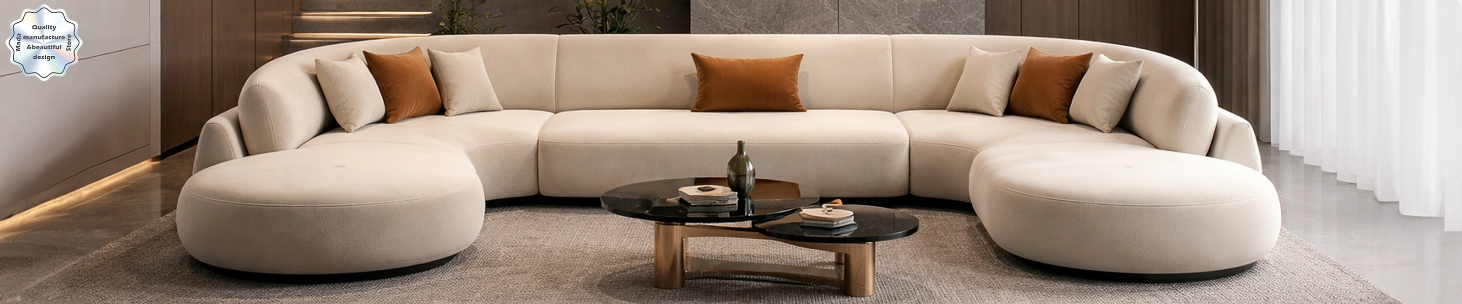 Modern corner sofa made of natural beech wood and bouclet fabric, 85X300 cm Materials: Natural beech wood - soft sponge - boucle fabric Dimensions: Length: 300cm Depth: 85 cm Height: 45 cm Total height: 75 cm Colors can be changed upon request. This product has special spe...