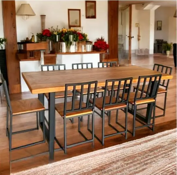 • ترابيزة سفرة مكونة من ترابيزة و 8 كراسي مصنوعة من حديد دهان الكتروستاتيك وخشب طبيعي عالي الجودة