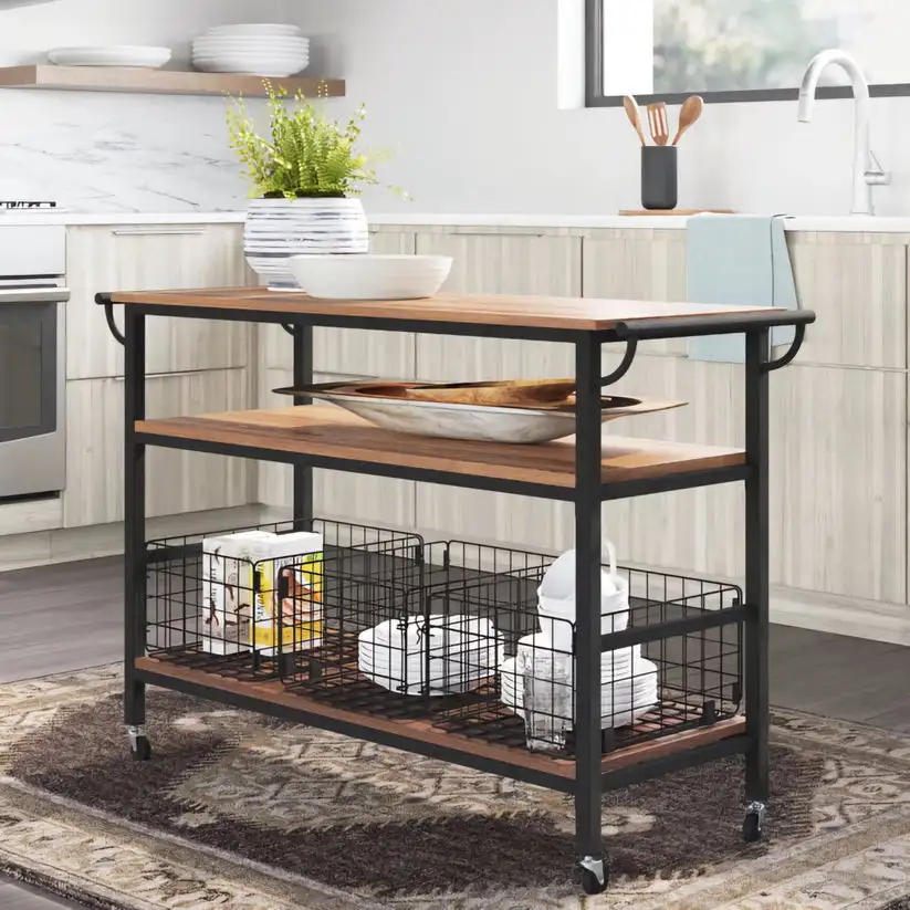 • ترابيزة ضيافة تروللي مصنوعة من حديد دهان الكتروستاتيك وخشب طبيعي