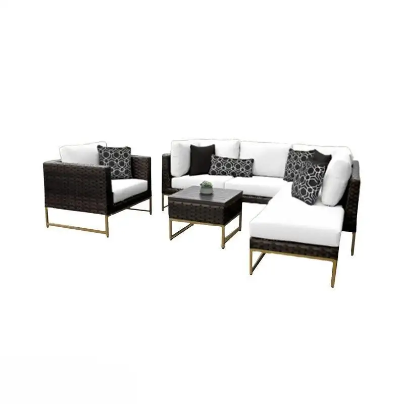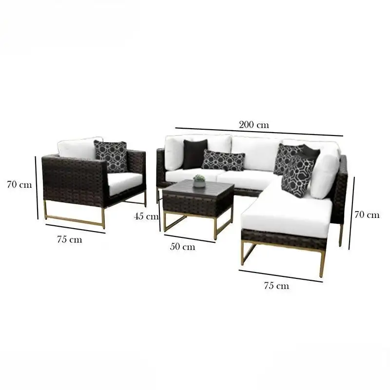 Elegant outdoor corner sofa with armchair and table, perfect for gardens and terraces. Made from weather-resistant materials and custom-built for maximum comfort.