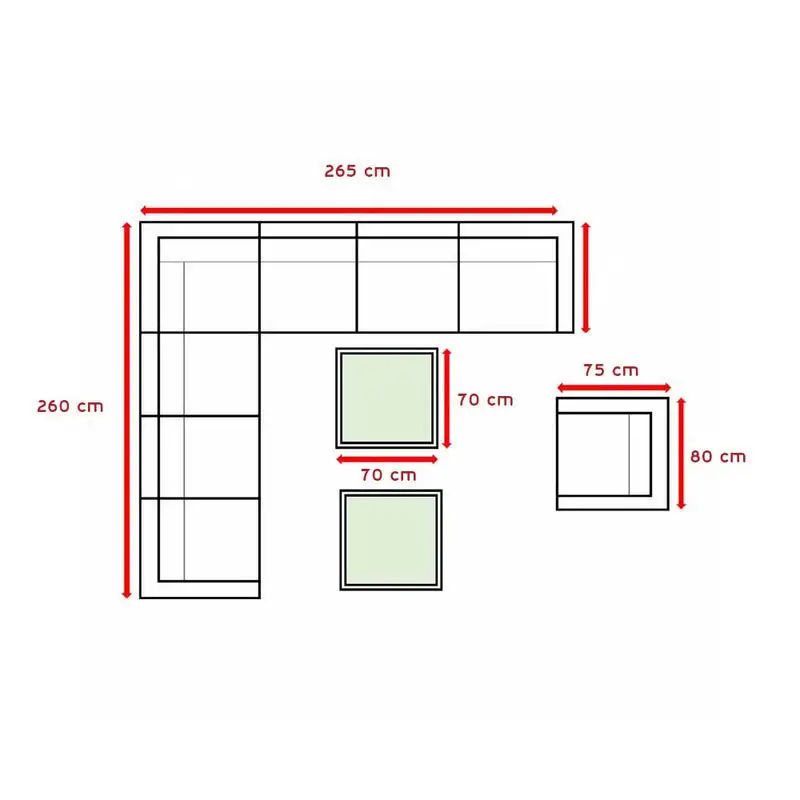ابعاد الركنة : العرض 265 سم – العمق 260 سم – الارتفاع 80 سم - عمق المقعد 75 سم