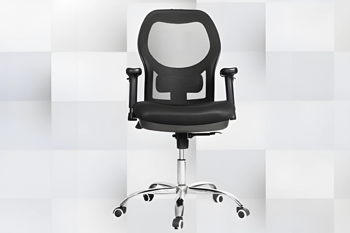 كرسي من مدي بظهر وسط وهيكل شبكي يوفّر جلوسًا متوازنًا وحركة مريحة، مناسب للاستخدام اليومي داخل المكاتب.