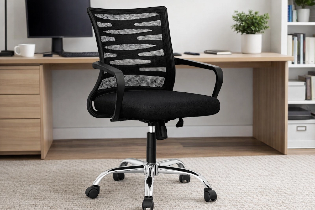 كرسي من مدي بظهر متوسط وهيكل شبكي مصمم لدعم العمود الفقري وتحسين التهوية، مناسب للجلوس لفترات طويلة يوميًا.