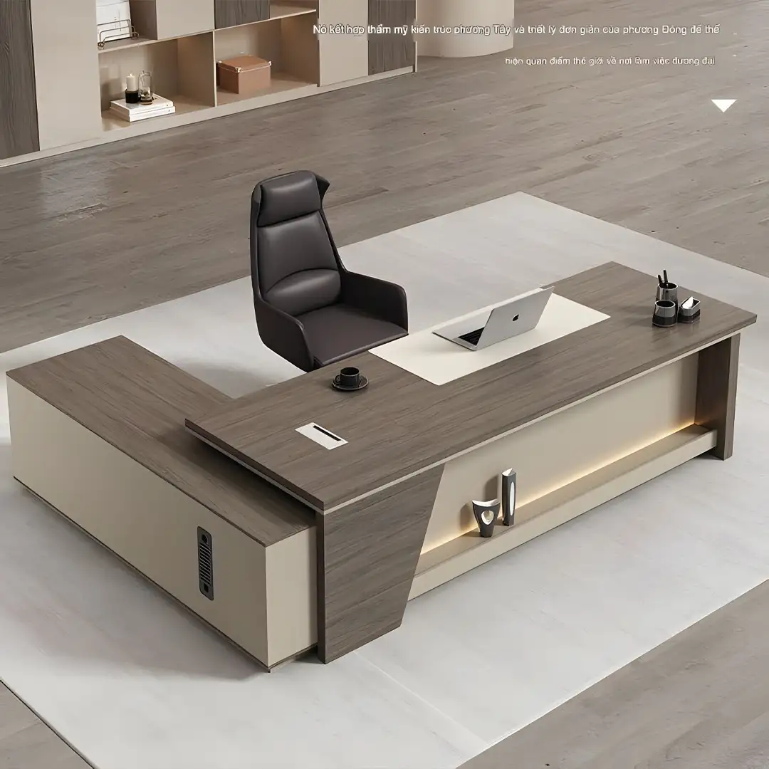 اكتشف مكتب مدير عصري مصنوع من خشب MDF عالي الجودة بتصميم أنيق يوفر الراحة والفخامة لمكتبك. مثالي لبيئات العمل العصرية ويوفر مساحة تنظيم عملية.