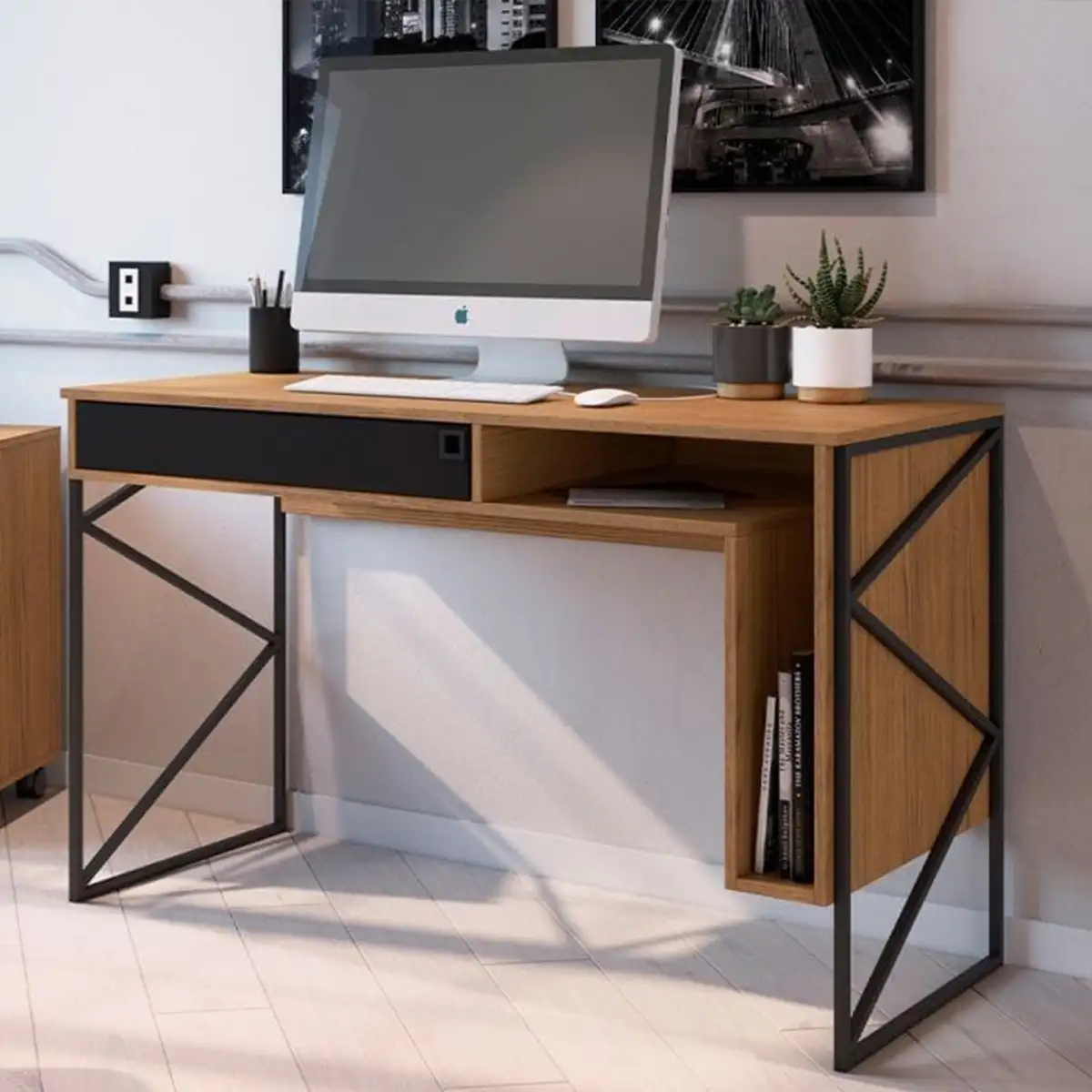 A stylish desk with a shelf and drawer, ideal for studying and daily work in small spaces. Its design