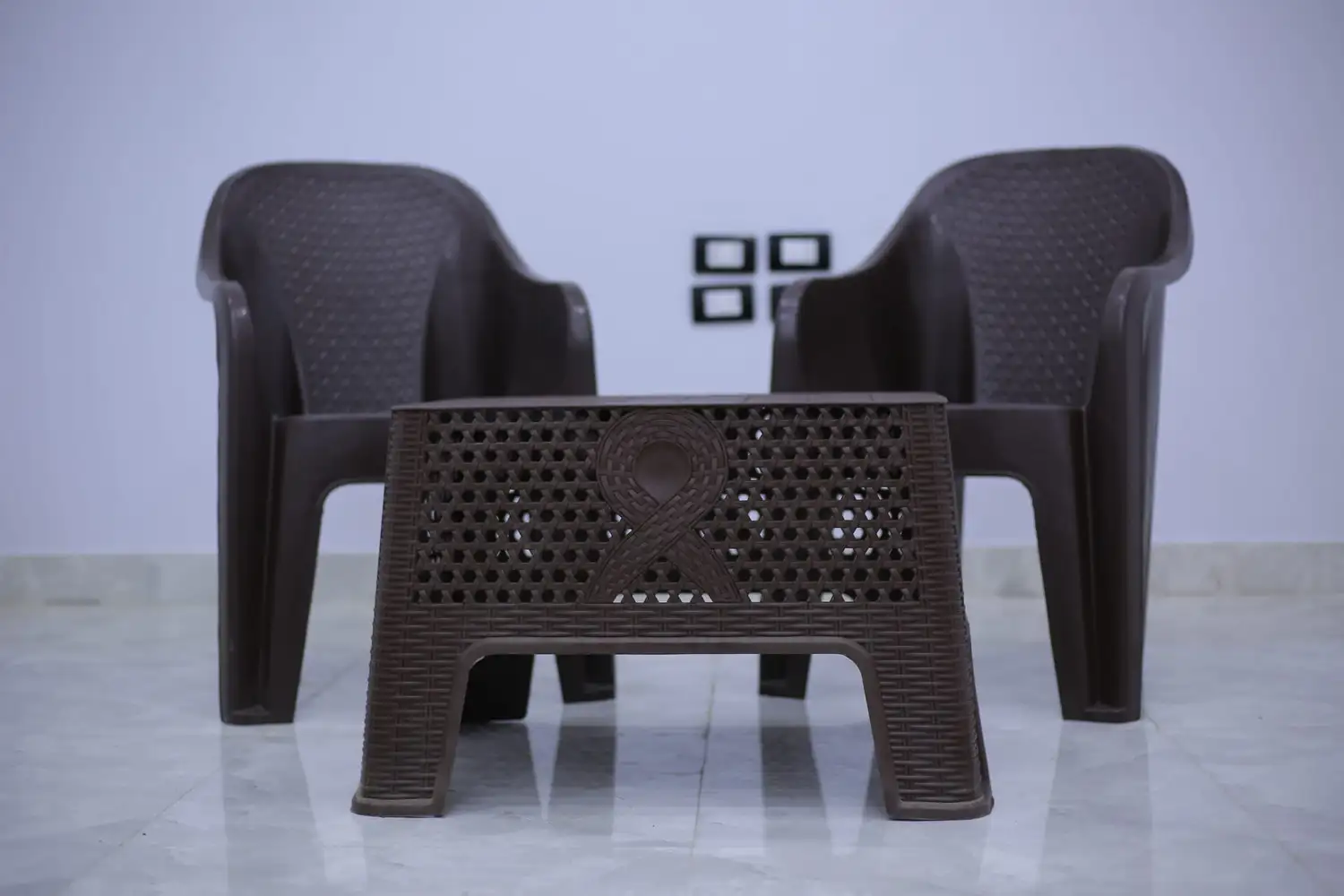 A practical and durable plastic chair set consisting of 2 chairs and a table, ideal for gardens and cafés