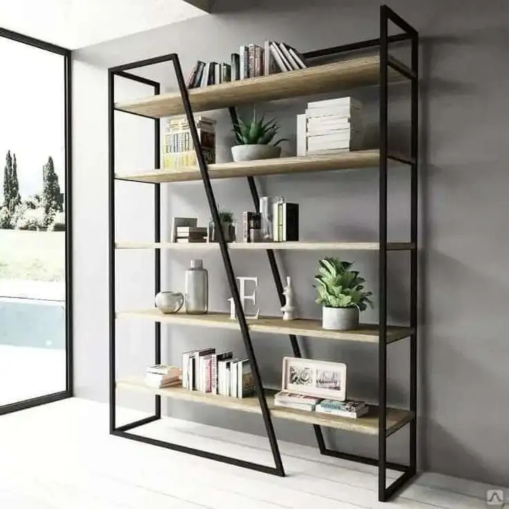 Multifunctional decorative library made of electrostatic painted iron with high-quality MDF wood shelves