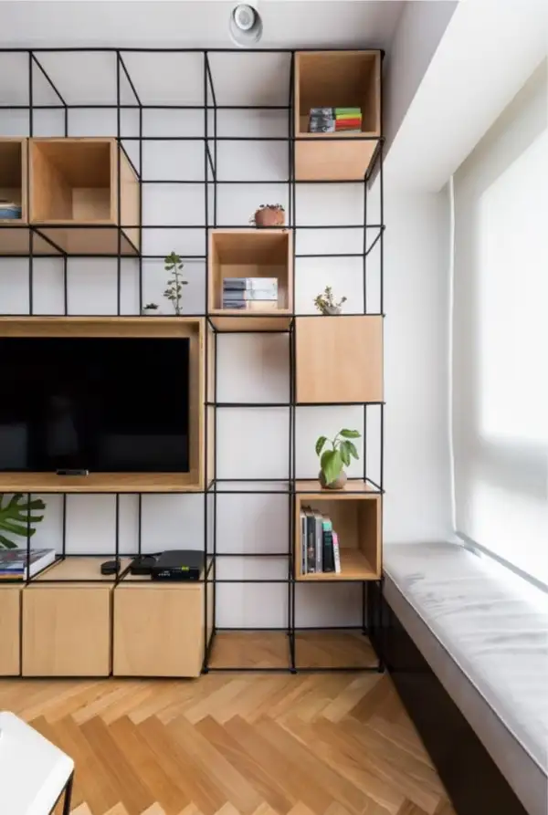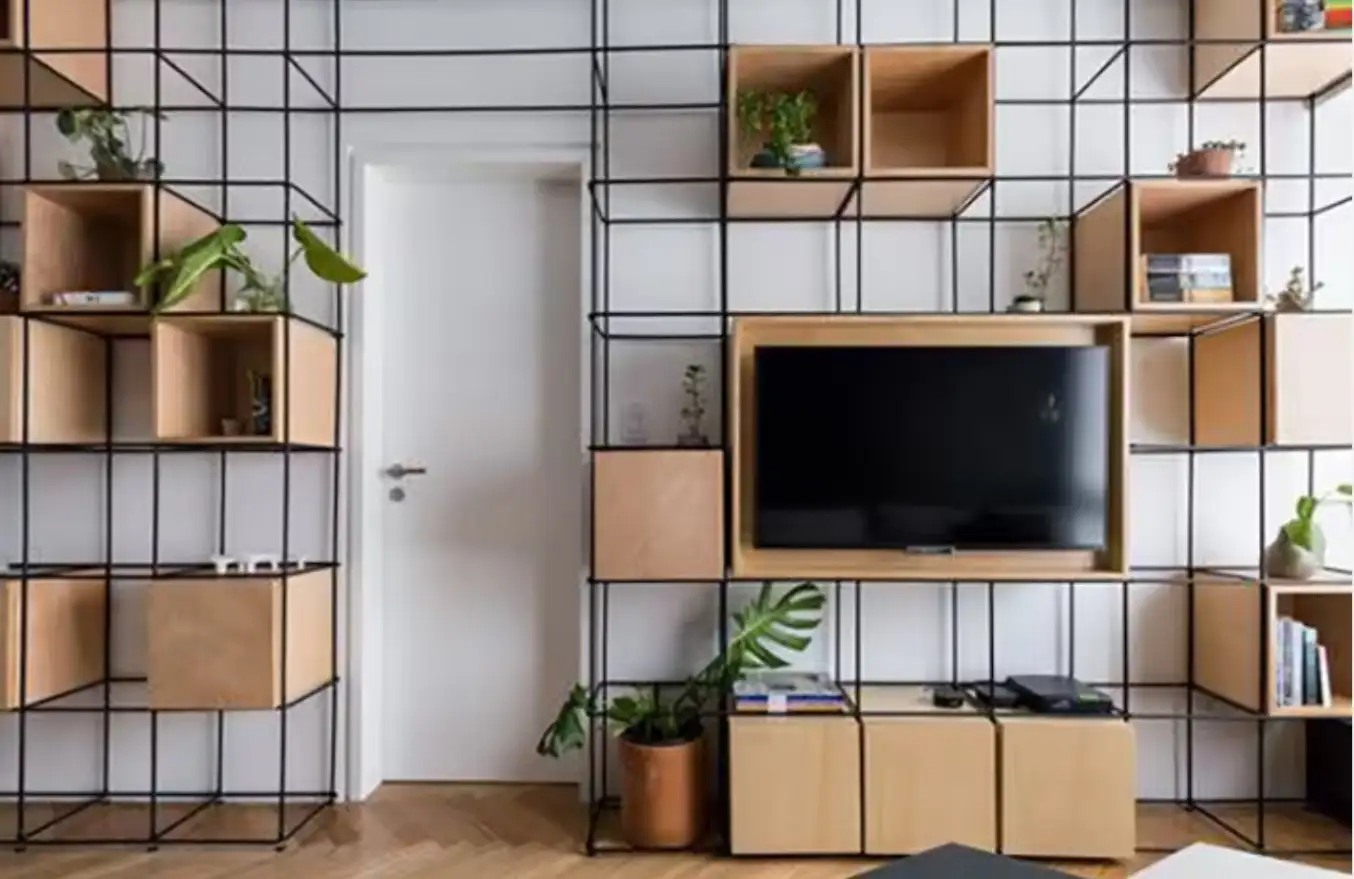 • وحدة تليفزيون مودرن مصنوعة من معدن معالج الكتروستاتيك و خشب كونتر اسباني عالي الجودة