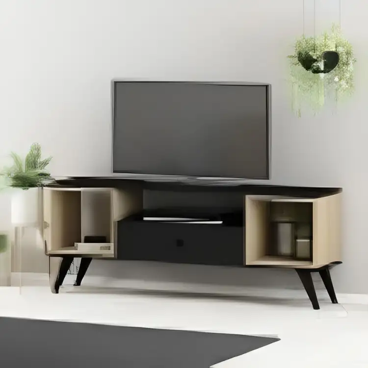 • طاولة تلفزيون مصنوعة من الخشب الأوروبي ومزودة بدرج قابل للطي + 3 أرفف.